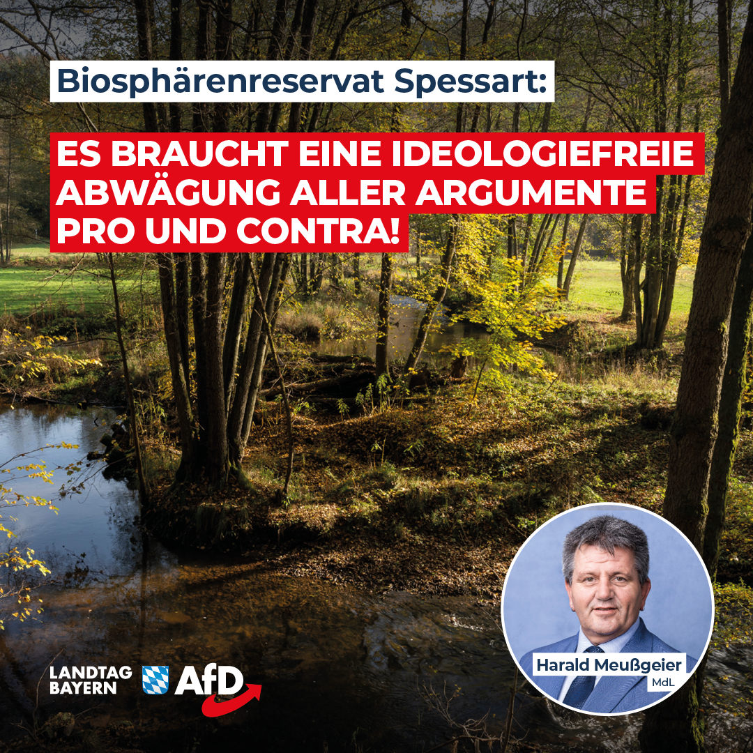 Die Debatte um die Errichtung eines Biosphärenreservats Spessart hat an Fahrt aufgenommen, nachdem Staatsminister Aiwanger sich hierzu positioniert hat. Das Vorhaben wird kontrovers diskutiert. Der forstpolitische Sprecher der AfD-Fraktion im Bayerischen Landtag, MdL Harald Meußgeier, sagt hierzu: „Die Bürger in den betroffenen Landkreisen und Gemeinden sollten letztlich entscheiden, ob sie ein Biosphärenreservat Spessart wollen oder nicht. Wir als AfD stehen [...]